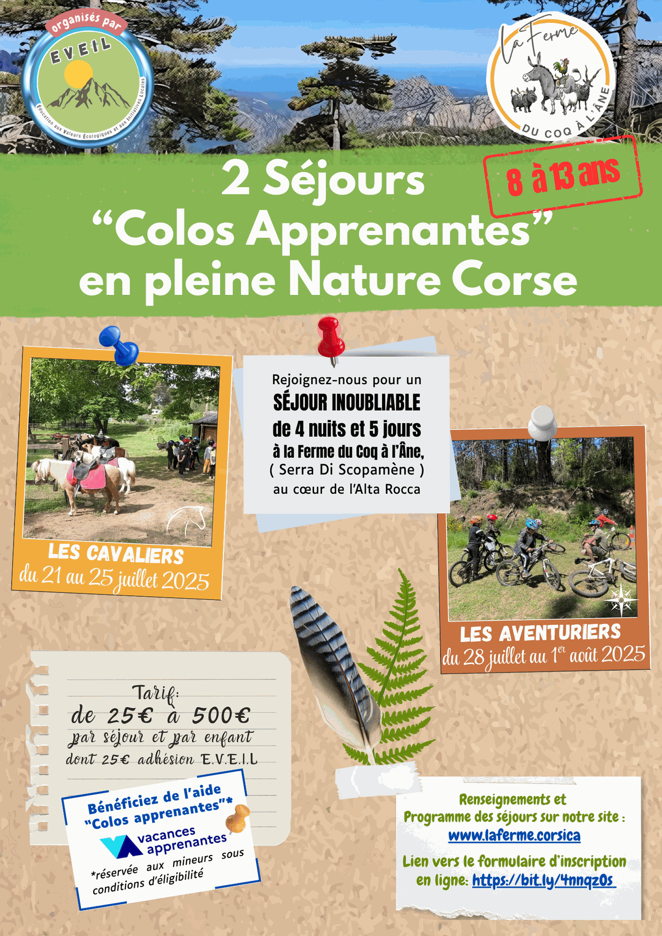 Nos séjours sont agréés par le Ministère des Sports, de la Jeunesse et la Vie Associative et par l’Académie de Corse. Vous pouvez ainsi bénéficier des aides "Colos apprenantes"